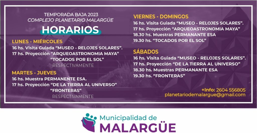 De mañana: 10 hs. Solo para escuelas con reserva previa. (planetariodemalargue@gmail.com).